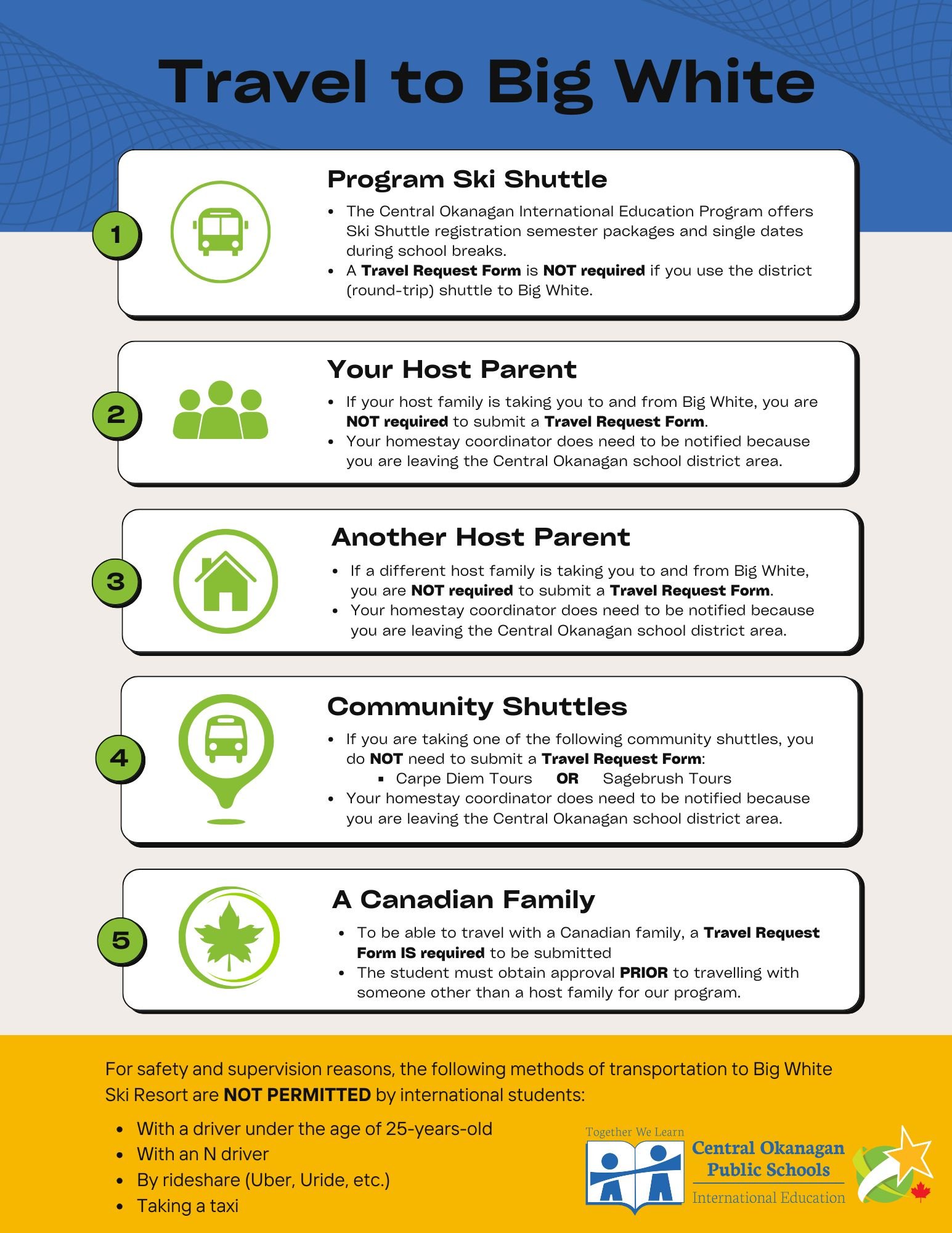 Click here for more information about permitted methods of transportation to/from Big White and when Travel Request Forms are required.